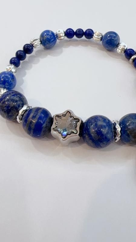 【一点もの・イタリア製メダイ使用】 深いブルーが美しいラピスラズリに、 守護と癒しの象徴とされる「ラファエルの天使メダイ」を合わせた、 上品で存在感のある天然石ブレスレットです。 中央には、現在は生産終了となった スワロフスキー社製 “BeCharmed(ビーチャームド)” のスターパーツを使用。 光を受けて星がきらめくように輝き、手元を華やかに彩ります。 ラピスラズリは、古くから“王の石”として大切にされてきた守護の石。 直感力を高め、迷いを晴らし、本来の自分へ戻るサポートをすると言われています。 天使ラファエルのメダイがそっと寄り添い、 心を穏やかに整えたい方にもおすすめです。 【サイズ】 仕上がりは16cmです。 手首にあわせてサイズ調整も可能ですので、 ご購入時の備考欄に《ご希望のサイズ》をご記入ください。 【素材】 ・ラピスラズリ ・スワロフスキー BeCharmed(スターモチーフ/廃盤) ・イタリア製 天使ラファエル メダイ ・金属パーツ ・オペロンゴム 【在庫】一点もの(再販なし)